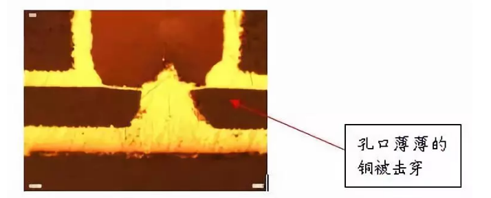 目前在行業(yè)通行的標準(IPC-650)里面,似乎還沒有給出對于樹脂塞孔的孔上面銅厚的要求,潛在的風險是,一旦樹脂塞孔的孔上面電鍍的銅厚偏薄,經(jīng)過內層HDI線路的表面處理,棕化處理以后,孔口上面的薄薄的銅會有被激光鉆孔鉆穿的可能,而且在電測試時是無法判定其有問題的。但這層薄薄的銅在耐高壓等方面的品質著實讓人擔憂。