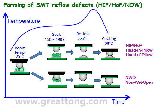 上圖將NWO(Non-Wet-Open)與HIP(Head-In-Pillow)或HoP(Head-of-Pillow)在SMT的Reflow溫度曲線下形成的原因稍微做了解釋,基本上兩者都是因?yàn)榘宀淖冃嗡?,只是HIP的錫膏會(huì)保留在電路板的焊墊上,但NWO則完全轉(zhuǎn)移到了錫球。